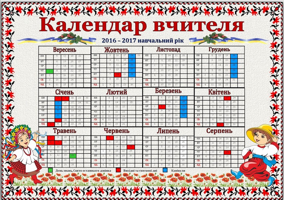 2016-2017 навчальний рік у школах, гімназіях та інших навчальних закладах почнеться в четвер 1 вересня 2016 року і триватиме до 26 травня 2017 року включно. Загальна тривалість навчального року складе 273 днів, з яких 165 днів будуть навчальними, а 108 днів припадуть на канікули, вихідні та свята.